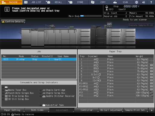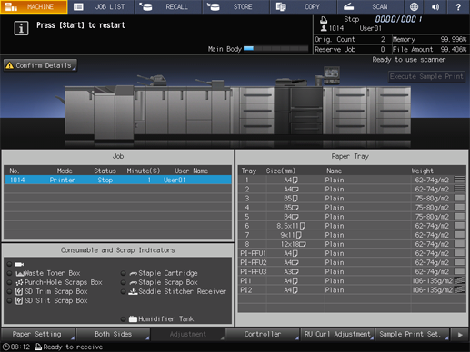 The paper setting of the selected tray (Current Setting) and that required by the print data (Reserved Setting) are displayed.