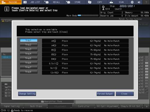 When the message that does not designate a specific tray is displayed, select any tray and change its paper settings (Current Setting) to settings that the print data requires (Reserved Setting). Load the tray with paper that conforms to specified conditions, and then start printing.