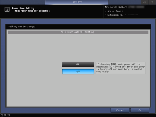 Select whether to automatically turn OFF the main power switch after the sub power switch is turned OFF and the main body has completely cooled down.