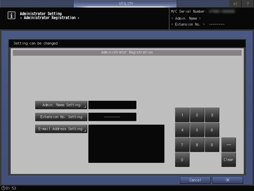 Register the Admin. Name and Extension No. to be displayed in the upper-right corner of the UTILITY screen. Also, register the e-mail address of the administrator.