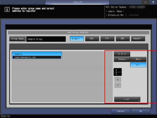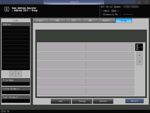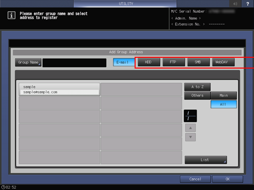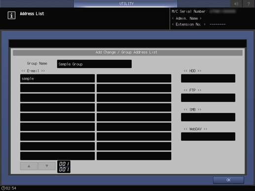 preconditionYou can register more than one destination in one group for E-mail. You can register only one destination in one group for each of HDD, FTP, SMB, and WebDAV.