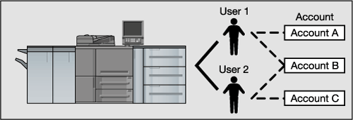 This system configuration is suitable for tracking individual users managed by each department when the machine is shared with multiple departments. With this setup made, the machine allows you to maintain the statistics both on each employee (each user) and on each department (each account).
