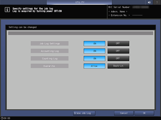 supplementary explanationPressing Erase Job Log erases the job logs saved on this machine.