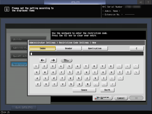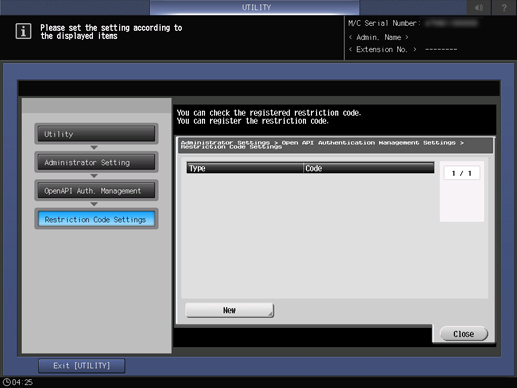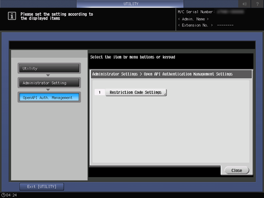 Press OpenAPI Auth. Management on the Administrator Setting Menu screen, and then press Restriction Code Settings.