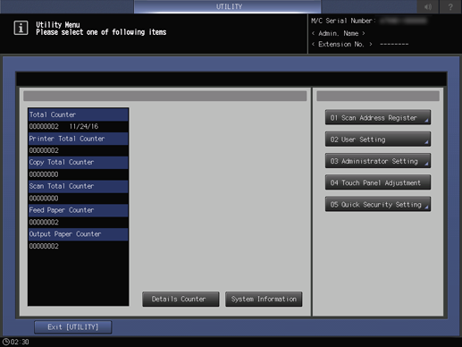 You can also display the Touch Panel Adjustment screen in the same way by pressing Utility/Counter on the control panel and then pressing 4 on the keypad of the control panel. If necessary, you can change the machine setting so that the Touch Panel Adjustment screen is displayed only when 4 on the keypad of the control panel is pressed with no item displayed on the UTILITY screen. For details, contact your service representative.