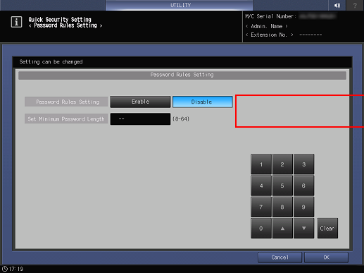 Selecting Enable sets the machine to accept passwords specified more strictly than usual, according to the password rules as described below.