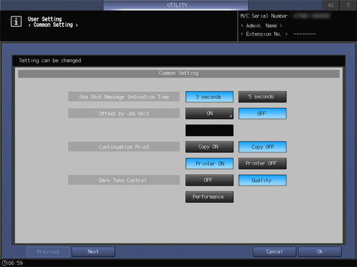 One Shot Message Indication Time | Select the time span to display a shot message, such as Original size is A4, in the message area of the touch panel. | 3 seconds, 5 seconds | |