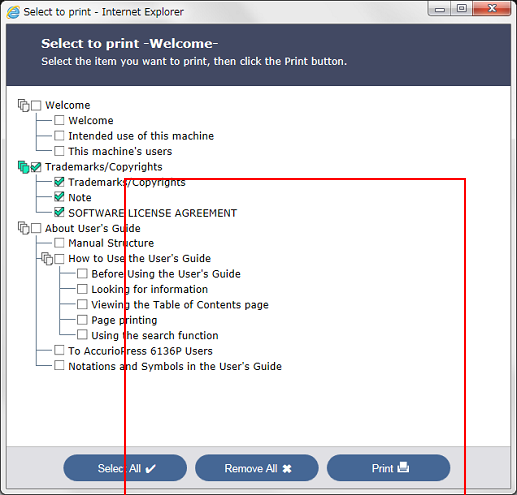 Clicking Select Print on the top right of the screen displays the pages selected with check boxes on the table of contents.