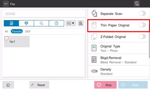 When scanning an original that is thinner than plain paper on the ADF, set this option to ON. This function reduces the original feed speed of the ADF to prevent thin paper from getting caught.