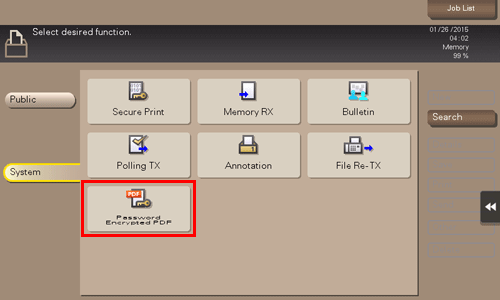• When printing or saving has completed, the file is deleted automatically from the Password Encrypted PDF User Box.