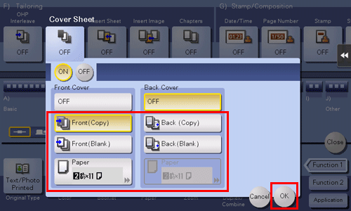 Use this option to copy the front and back covers onto separate paper when copying an original with a front or back cover. When copying an original without a front or back cover, you can use this function to have blank sheets of paper inserted as the front and back covers.