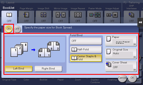 The original pages loaded are automatically arranged into an order appropriate for center binding, and the 2in1 function is activated to copy on both sides of the paper.