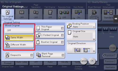 Even for an original with pages of different sizes, by using the ADF, you can scan data while detecting the size of each page. If the widths of the originals are the same, select [Same Width]. If the widths of the originals are different, select [Different Width].