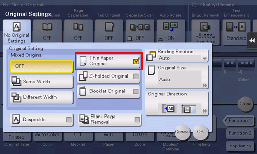 When [Thin Paper Original] is specified to scan an original of thinner paper than plain paper using the ADF, the system reduces the original feed speed to prevent thin paper from causing a paper jam.