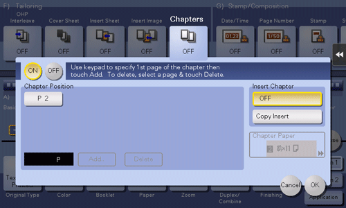 [Chapter Paper] | If [Insert Chapter] is set to [Copy Insert], select the paper tray where the Chapter Paper is stacked. If the chapter paper and text paper differ, use the same size of paper and stack them in the correct direction. |