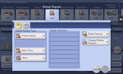 [ON]/[OFF] | Select [ON] to set Stamp Repeat. |