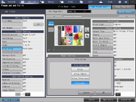 Touch panel - [MACHINE] - [JOB LIST] - [Hold Job] - [Page Edit] - [Job Ticket Edit] - [Pile Allow]