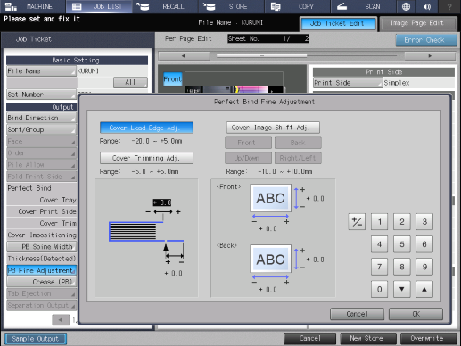 Touch panel - [MACHINE] - [JOB LIST] - [Hold Job] - [Page Edit] - [Job Ticket Edit] - [PB Fine Adjustment]