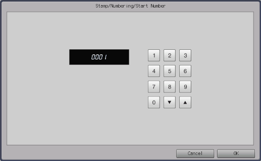 Touch panel - [MACHINE] - [JOB LIST] - [Hold Job] - [Page Edit] - [Job Ticket Edit] - [Stamp Numbering] - [Start Number] | |||