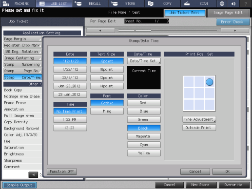 Touch panel - [MACHINE] - [JOB LIST] - [Hold Job] - [Page Edit] - [Job Ticket Edit] - [Stamp Date/Time]