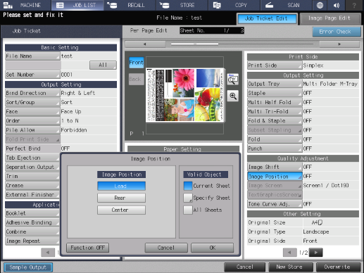 Touch panel - [MACHINE] - [JOB LIST] - [Hold Job] - [Page Edit] - [Job Ticket Edit] - [Image Position]