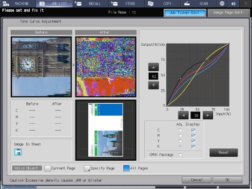 Touch panel - [MACHINE] - [JOB LIST] - [Hold Job] - [Page Edit] - [Job Ticket Edit] - [Tone Curve Adj.]