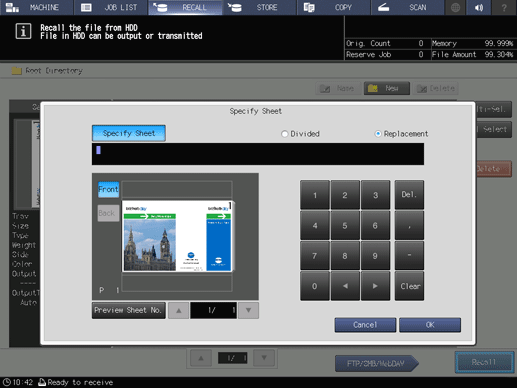 To output the specified sheet while existing job tickets are maintained, press [Divided]. The [Stamp/Page No.] is renumbered in the specified sheet.