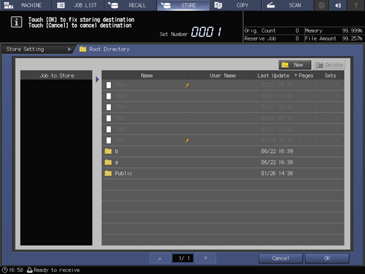 To display the [Root Directory] screen, press [HDD Store]. Set the storage location, and press [OK].