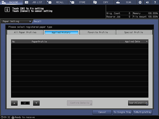 [Applied History] | Displays the history in which a paper profile is set to a paper tray. |