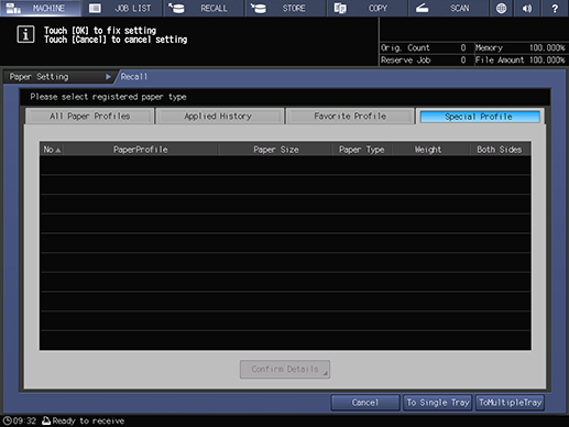 Even if many paper profiles are registered, you can easily recall the target paper profile using the sort function, [SearchCondition], or [Confirm Details].