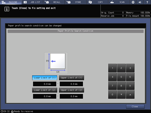 Touch panel - [MACHINE] - [JOB LIST] - [Hold Job] - [Job Ticket] - [Job Ticket Edit] - [Profile No.] - [SearchCondition] | |||