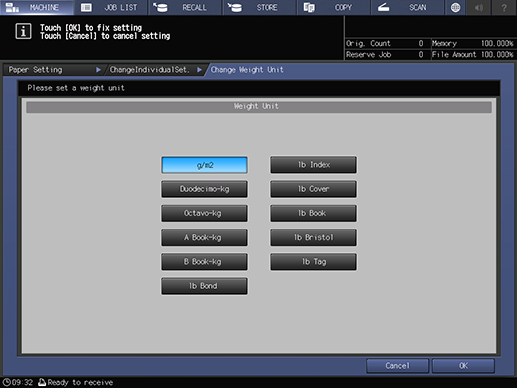 Touch panel - [MACHINE] - [Paper Setting] - [New Setting] - [Weight] | |||