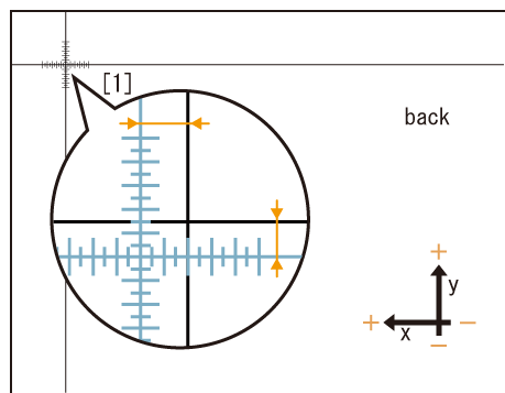 " of [1] misaligned with the front side by 2.0 mm on the plus side of the X-axis, and by 1.5 mm on the minus side of the Y-axis. In this case, for [1], you want to move the blue line of the back side by 2.0 mm in the minus direction on the X-axis, and by 1.5 mm in the plus direction on the Y-axis. This can be compensated by entering 20 for X and pressing [+ / -], and entering 15 for Y.