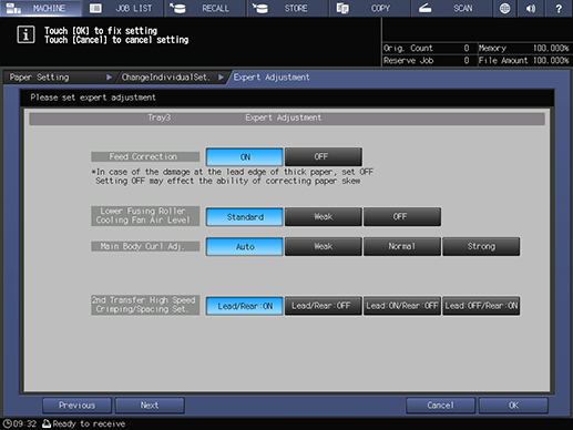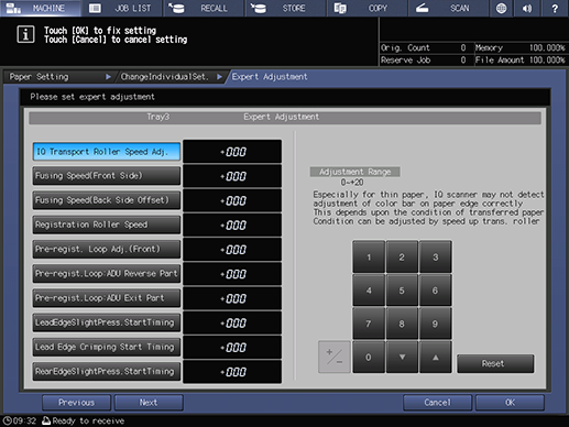 Touch panel - [MACHINE] - [Paper Setting] - [New Setting] - [Expert Adj.]
