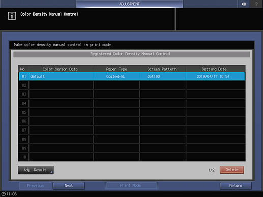 Touch panel - [MACHINE] - [Adjustment] - [Quality Adjustment] - [Color Density Control] - [Color Density Manual Control]