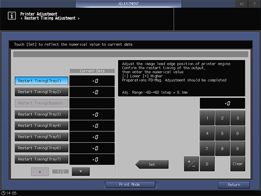 Screen access | Touch panel - [MACHINE] - [Adjustment] - [Machine Adjustment] - [Printer Adjustment] - [Restart Timing Adjustment] | ||
