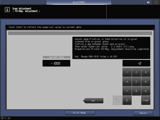 Screen access | Touch panel - [MACHINE] - [Adjustment] - [Machine Adjustment] - [Scan Adjustment] - [FD-Mag. Adjustment] | ||