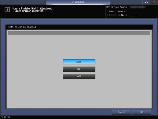 Touch panel - [MACHINE] - [Adjustment] - [Finisher Adjustment] - [Staple Finisher Adjustment] - [Staple Finisher(Main) Adj.] - [Upper Gripper Operation]