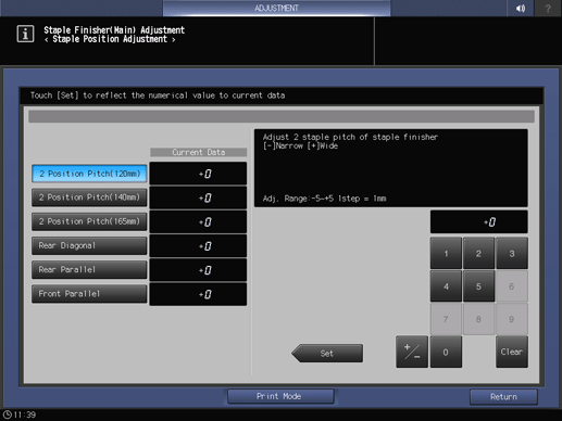 Screen access | Touch panel - [MACHINE] - [Adjustment] - [Finisher Adjustment] - [Staple Finisher Adjustment] - [Staple Finisher(Main) Adj.] - [Staple Position Adjustment] | ||