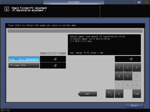 Control panel - Utility/Counter - [Administrator Setting] - [System Setting] - [Expert Adjustment] - [Finisher Adjustment] - [Staple Finisher Adjustment] - [Staple Finisher(PI) Adj.] - [PI Registration Adjustment] | |||