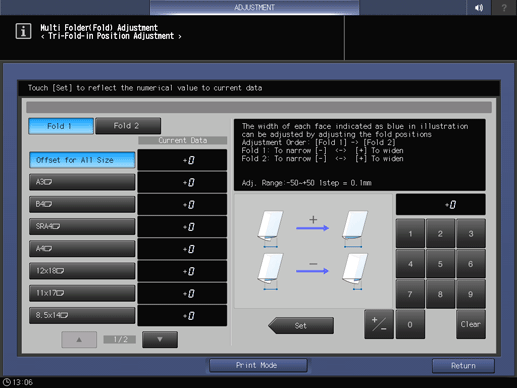 Screen access | Touch panel - [MACHINE] - [Adjustment] - [Finisher Adjustment] - [Multi Folder Adjustment] - [Multi Folder(Fold) Adj.] - [Tri-Fold-in Pos. Adj.] | ||
