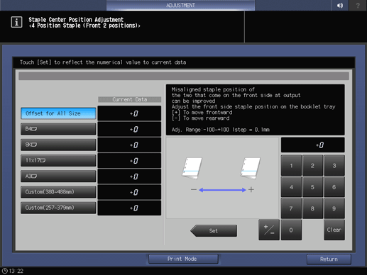 Screen access | Touch panel - [MACHINE] - [Adjustment] - [Finisher Adjustment] - [Saddle Stitcher Adjustment] - [Staple Center Position] - [4 Position Staple(Front 2)] | ||