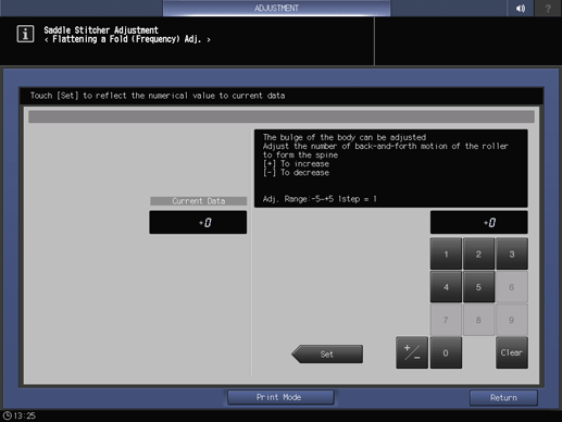 Screen access | Touch panel - [MACHINE] - [Adjustment] - [Finisher Adjustment] - [Saddle Stitcher Adjustment] - [Flattening a Fold (Freq.)] | ||