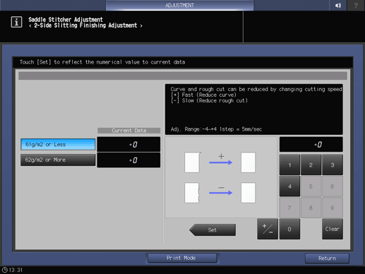 Screen access | Touch panel - [MACHINE] - [Adjustment] - [Finisher Adjustment] - [Saddle Stitcher Adjustment] - [2-Side Slit Finishing Adj.] | ||