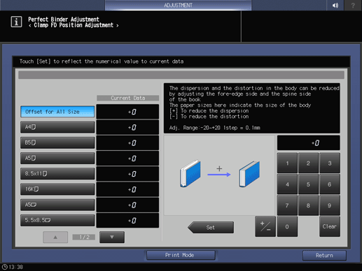 Screen access | Touch panel - [Adjustment] - [Finisher Adjustment] - [Perfect Binder Adjustment] - [Clamp FD Position Adj.] | ||
