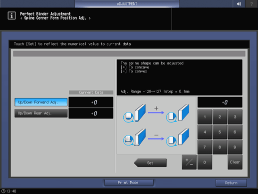 Screen access | Touch panel - [MACHINE] - [Adjustment] - [Finisher Adjustment] - [Perfect Binder Adjustment] - [Spine Corner Forming Pos.] | ||