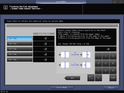 Control panel - Utility/Counter - [Administrator Setting] - [System Setting] - [Expert Adjustment] - [Finisher Adjustment] - [Trimmer Unit Adjustment] - [Finishing Position Adj.] - [Crease(Down Convex) Position] | |||