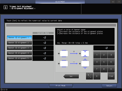 Screen access | Touch panel - [MACHINE] - [Adjustment] - [Finisher Adjustment] - [Trimmer Unit Adjustment] - [CD Alignment Adjustment] | ||