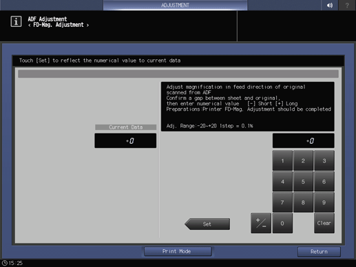 Screen access | Touch panel - [MACHINE] - [Adjustment] - [ADF Adjustment] - [FD-Mag. Adjustment] | ||