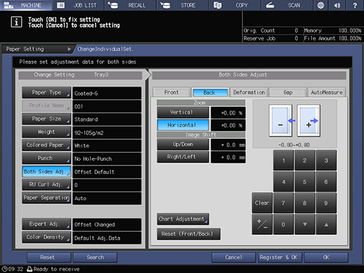 Touch panel - [MACHINE] - [Reg./Del.PaperSet.] - [Add/Edit] - [Both Sides Adj.] - [Back] | ||||